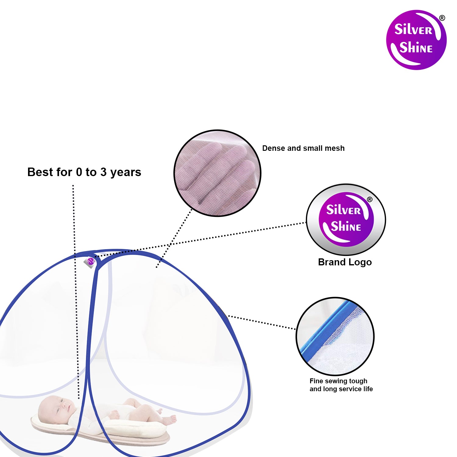 Foldable Baby Mosquito Net Along which Stand On 4(Four) spring steel Rod a cloth carry bag. These cloth carry bags are more durable than other bags in the market. Light weighted net makes it convenient for users to take it along while travelling. It's easy to fold provision makes it all the more hassle free.Easily washable , Self supporting, no requirement of NailNew Born Baby Foldable mosquito Net. The net is very durable and can be opened and closed daily.Can accommodate a Baby foldable mosquito net. The net is very durable and can be opened and closed daily Single Size Mosquito Net | SIZE: L-77 cm,W-70 cm,H-82 cm