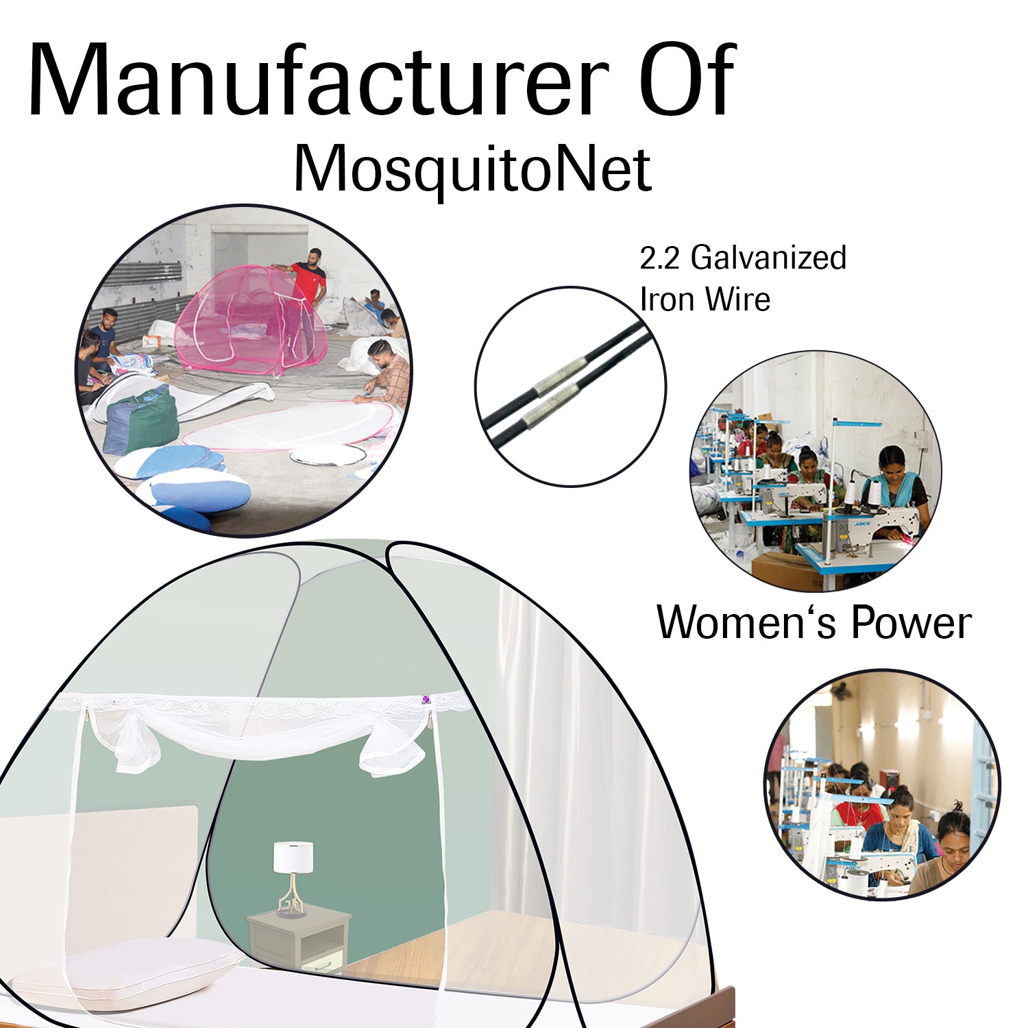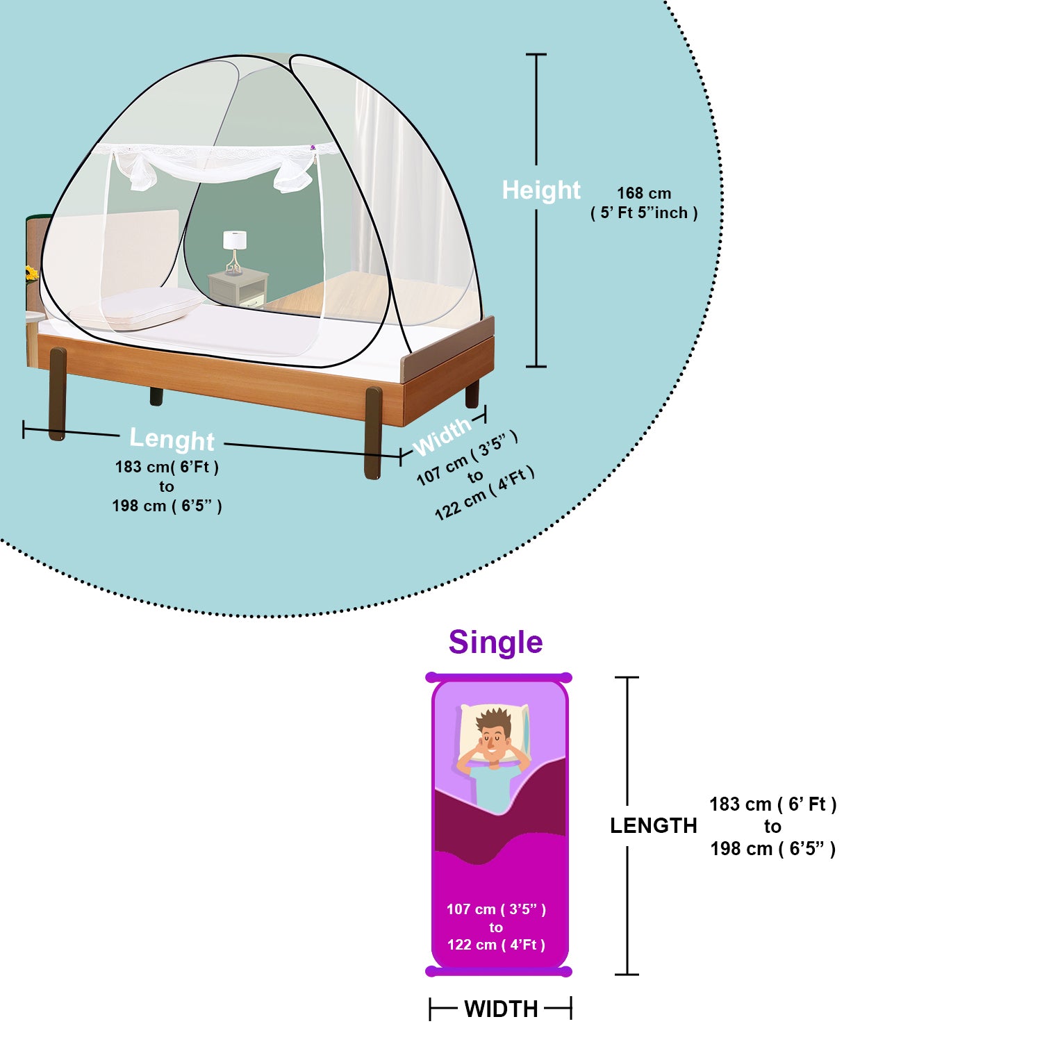 Mosquito Net is easy to install and pop-ups instantly and automatically. The net are of generous size which can easily fit any bed size . The net has large zippers for easy entry and exit. The mosquito net has a of soft fabric that has tiny holes which keeps not only mosquitoes out but also other insect out and yet allows breeze of air for comfortable and peaceful sleep. Size of Single Bed is 200*107*180 cms (i.e. 6.56*3.5*5.75 Ft) can Easily accommodate bed for Single bed.Single Bed Mosquito Net Single bed mosquito net gives complete protection from mosquitoes:: flies and insects. made up with polyester fabric and fine mesh ensures it to be a quality product. It restricts the entry of flies and mosquitoes which gives a pleasant sleep to you and your child as well. Being spacious it covers the Single Bed easily. It has 1 large zipper gates which allows easy entry and exits. Its easily fold able facility and being light weighted makes it easy to carry and install any where quickly Availability of net in different colors gives people a choice to choose according to the decor of the bedroom.Stylish:: spacious:: different colors makes it a product which can be used to enhance the decor of house as well. being easily washable it assures that you get a clean ambiance to sleep in and enjoy the pleasant sleep